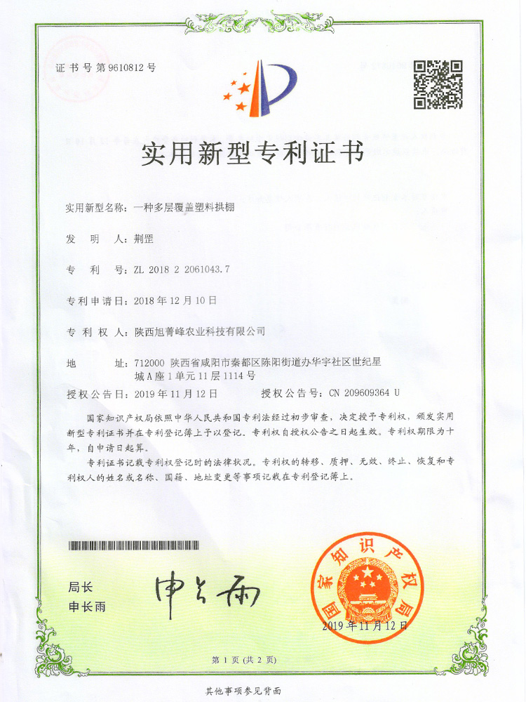 旭菁峰农业在实践中不断创新,拥有多项新型专利。
